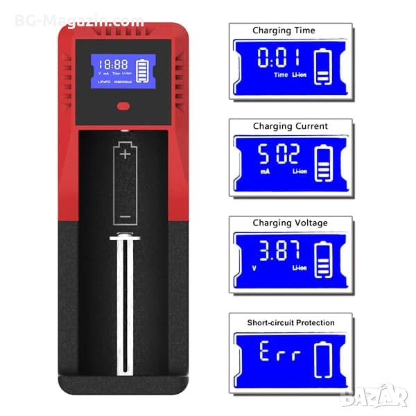 – Графичен LCD дисплей: Показва реалния моментен капацитет, напрежение и ток на зареждане за всяка батерия.