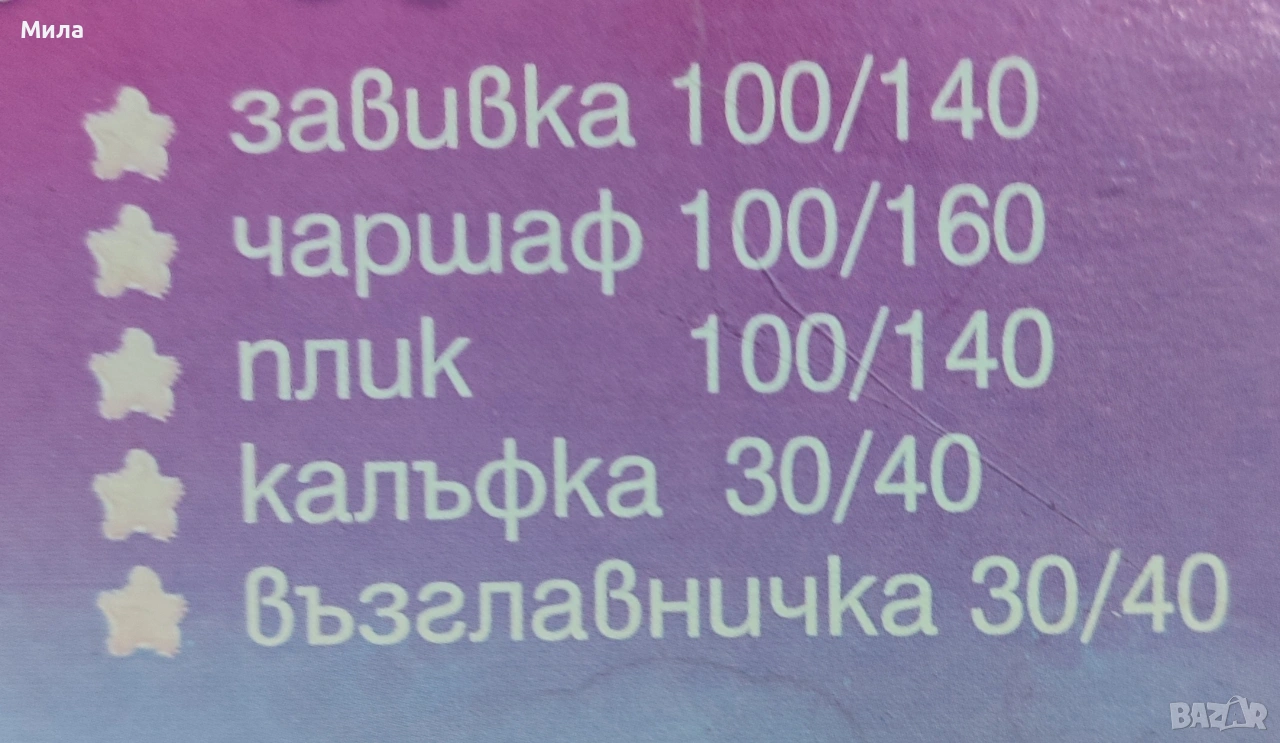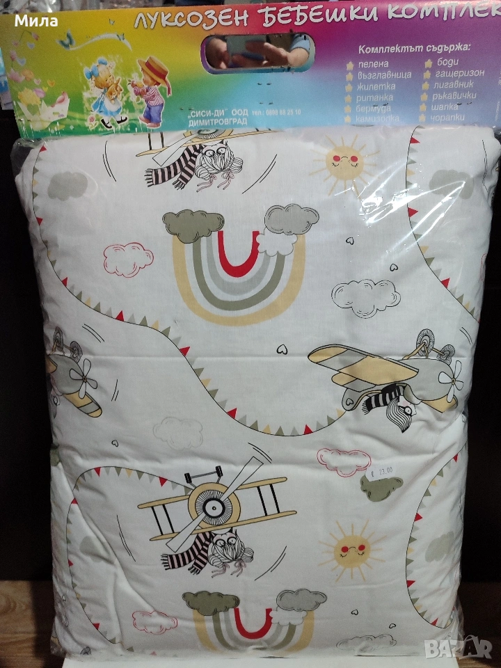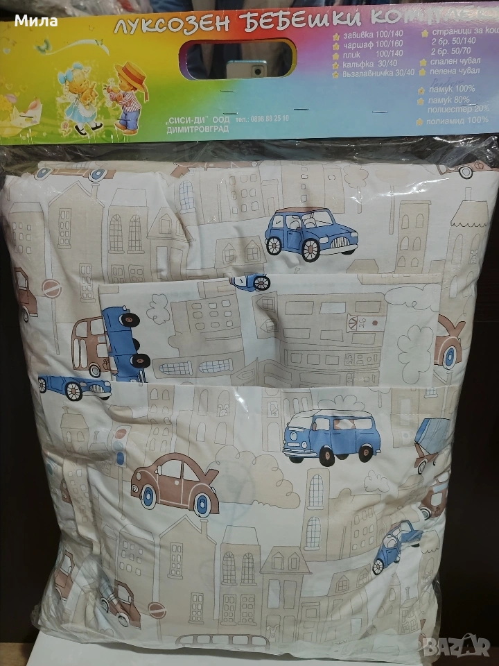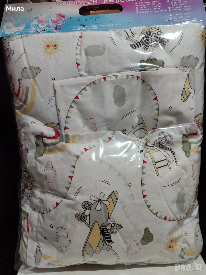 Включва чаршафче, олекотена завивка, плик, възглавничка, калъфка.