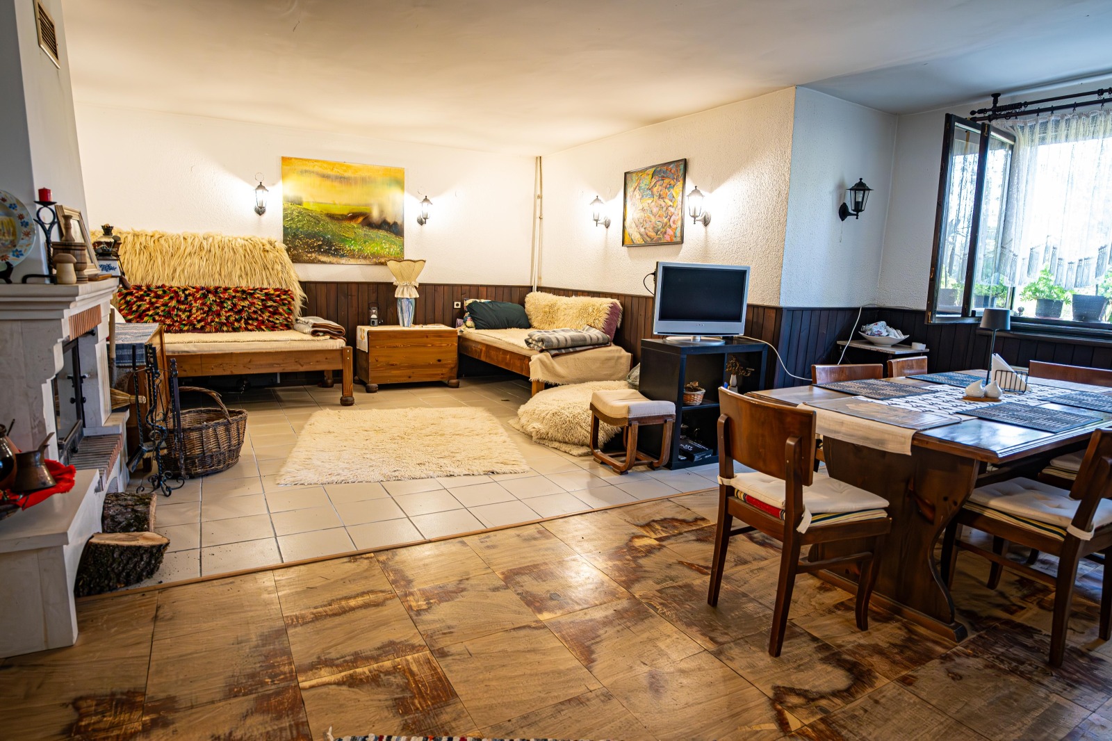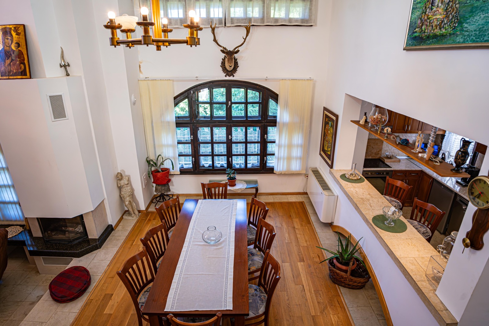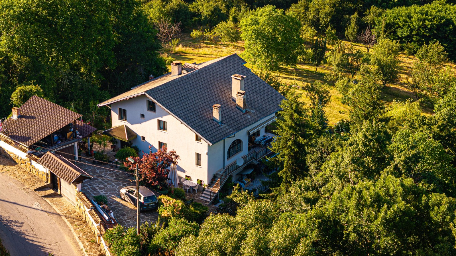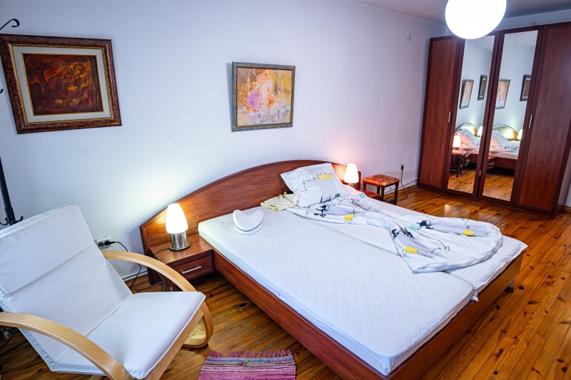Продава се!!! Семейна, триетажна, масивна къща находяща се в село Горно Трапе, разположено в полите на Троянския Балкан. Застроена площ: 220 кв.м., Дворно място: 4000 кв.м. До преди няколко години къщата успешно е функционирала като къща за гости. Разполага с две холни помещения с кухненски боксове, емпоре, две камини, внос от Франция, пет спални, три бани, две големи тераси с обзаведени кухненски боксове и барбекю, сауна, котелно помещение. В направата на къщата са използвани висококачествени, естествени материали! Има външна изолация. В двора са построени стопански помещения за инвентар, два закрити гаража и паркоместа за няколко коли. Двора е добре подържан и е достатъчно голям за бъде построен басейн. Водозахранването е от централен водопровод, но в имота има и хидрофор, в случай на нужда. Канализацията отвежда в 2 законни септични ями. Отоплението е на твърдо гориво с радиатори във всяка стая и три конвектора, които се захранват от котелно, в което има и голям бойлер, захранващ с топла вода цялата къща. Къщата е напълно обзаведена и се продава с цялото обсавеждане, което е стопанисвано грижливо, с изключение на някои лични вещи.