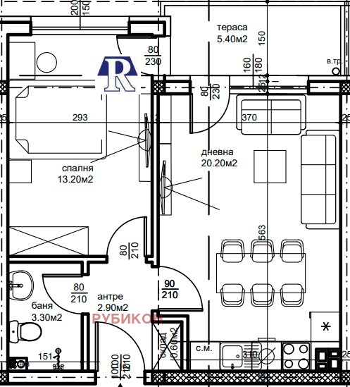 Разпределението на апартамента е както следва: просторна дневна с кухненски бокс( 20.20кв.м),спалня(13.20кв.м), баня с тоалетна(3.30кв.м), антре(2.90кв.м),тераса(5.40кв.м) и склад(0.6кв.м.). Застроена площ 52.40 кв.м. Общи части - 7,48 кв.м. Обща площ- 59.88кв.м.