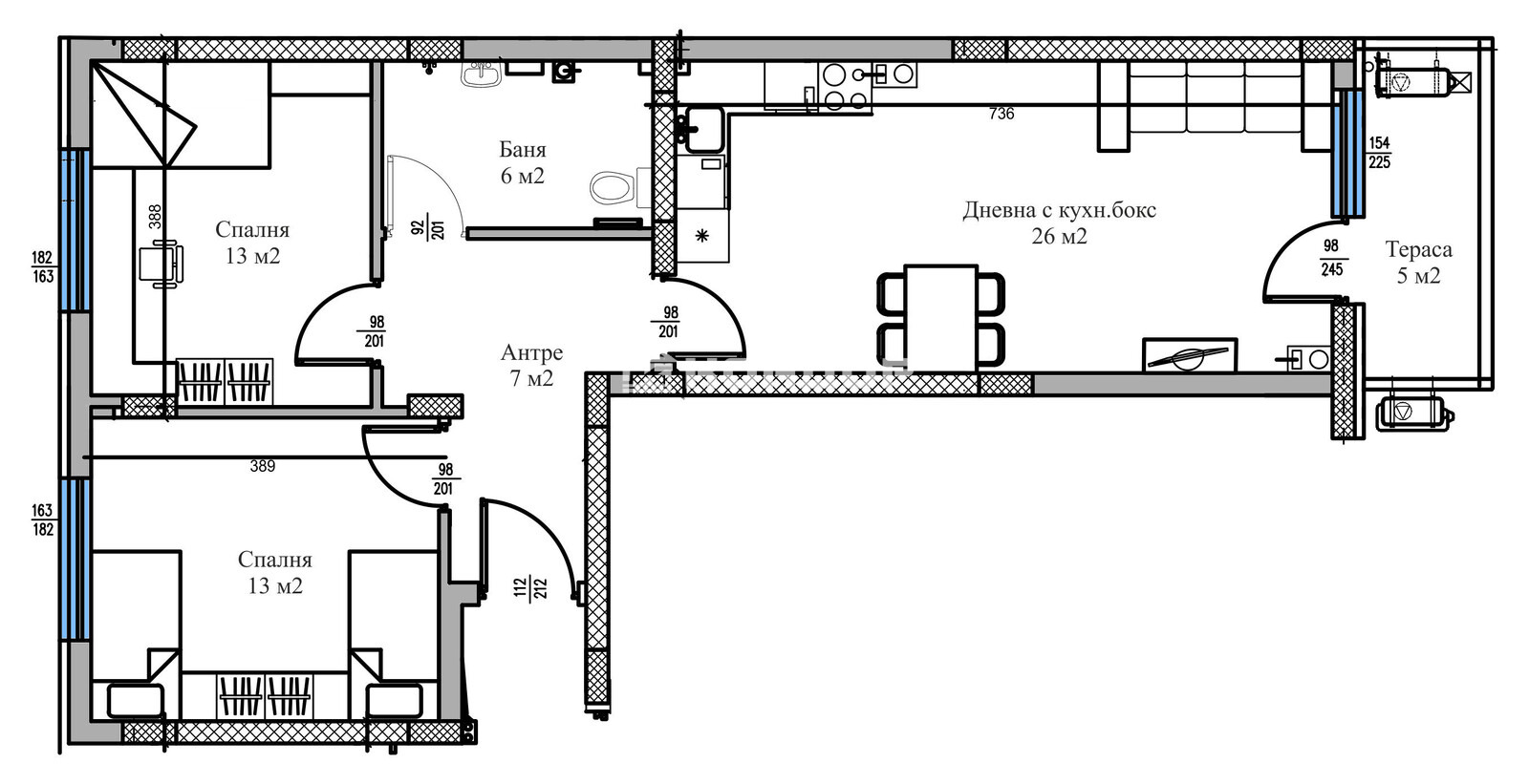 Разпределения - Предлагаме на Вашето внимание тристаен апартамент, състоящ се от дневна 26кв.м. с трапезария и кухненски бокс с излаз на тераса, две самостоятелни спални по 13 м2, голяма баня с тоалетна и входно антре. Към апартамента има прилежаща изба от 3кв.м. включена в цената.