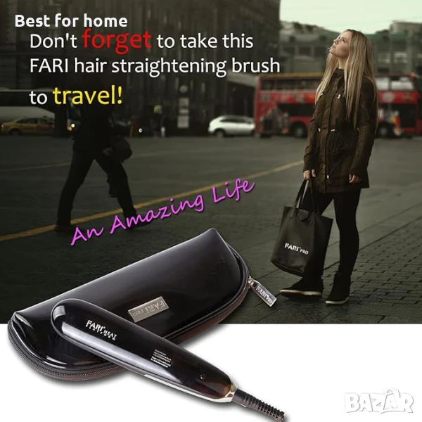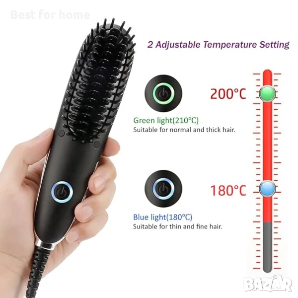 1. Включете устройството в контакта. 2. Изберете желаната температура (180 °C или 200 °C), като използвате превключвателя с един бутон. 3. Изчакайте да се загрее. 4. Срешете косата с устройството, като започнете от корените и се придвижвате надолу към краищата. 5. Използвайте въртящия се на 360 градуса кабел за лесна маневреност. 6. След употреба, изключете устройството и го оставете да се охлади преди съхранение. 7. Съхранявайте в предоставената чантичка за пътуване.