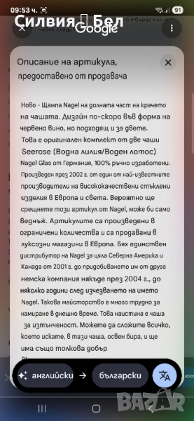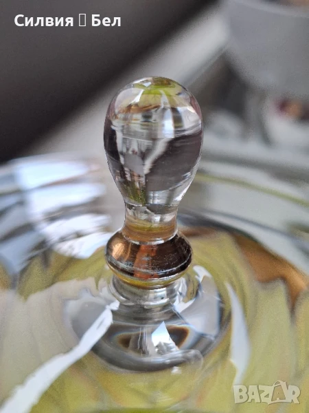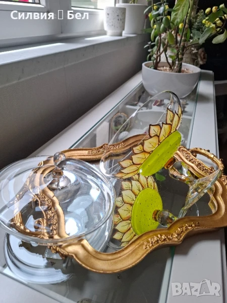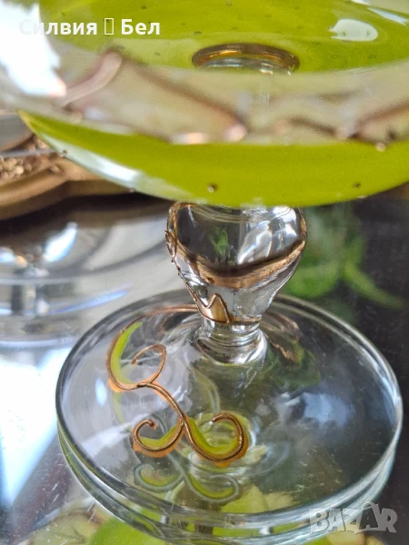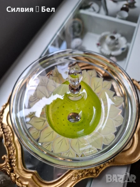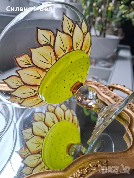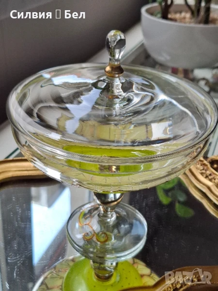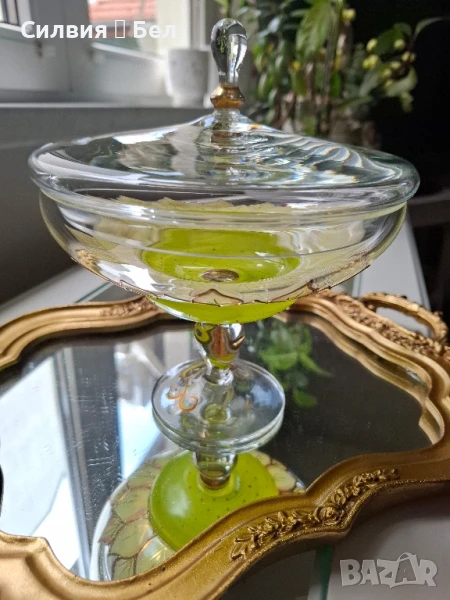Отличава се с фин ръчно рисуван декор – стилизирани листа в топли нюанси на златисто и зелено, които придават ефирност и артистичност на съда.Изработена с внимание към детайла, със стабилна, изящна основа и ефектна форма. Цветният акцент в основата носи ретро очарование и напомня за майсторската изработка от средата на 20-ти век.Прекрасен избор за изтънчен интериор, колекция или подарък с характер. ೋ🌷 ೋ🌷 ೋ🌷📏 Размери: (около 20/20см.)📍 Произход: Германия, марка NAGEL🎨 Материал: духано стъкло, ръчно рисуван декор.🕰️ Състояние: отлично винтидж състояние.
