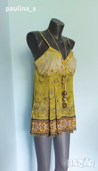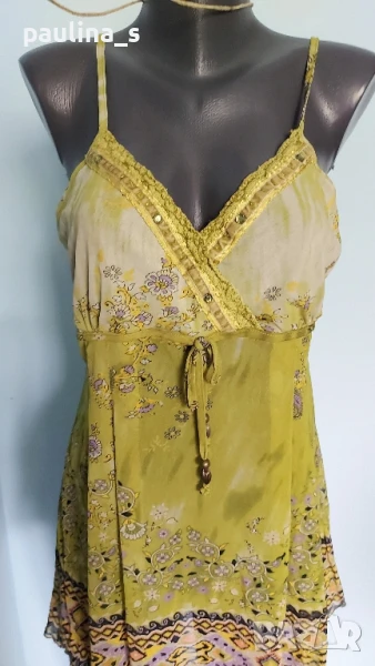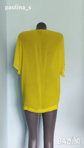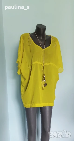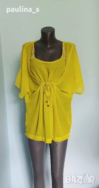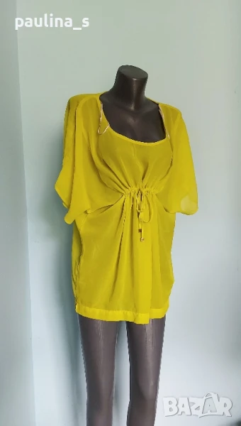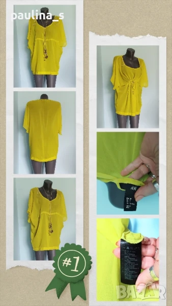 2️⃣. Колаж / M / 2XL - Жълта "H&M". Цената е 19,99лв / 10 евро. Брандова туника от органза, прозрачна е, подходяща и за плаж. Моделът е с падащи рамене и набор под бюста, покрива няколко размера, посочени са. Материята е ефирна органза, без еластичност. Без дефекти и етикет.