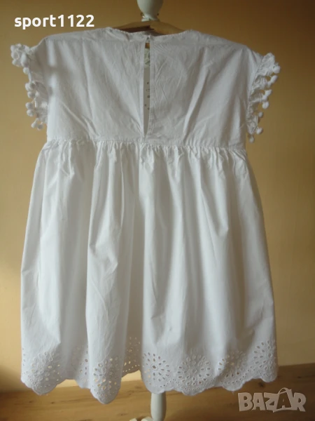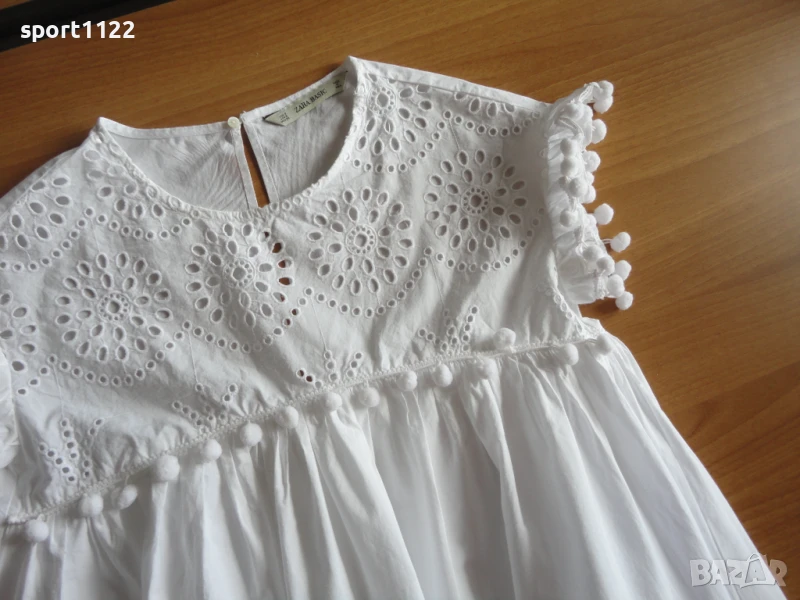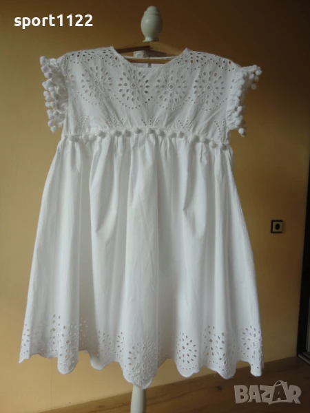 Рокля Zara, размер S, от бяла памучна дантела, 100% памук. Долната част е подплатена. Широка, стои красиво и кукленско. Обличана два, три пъти, няма забележки.