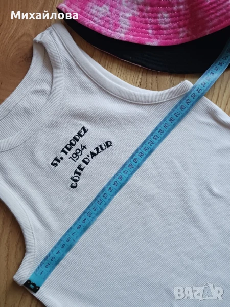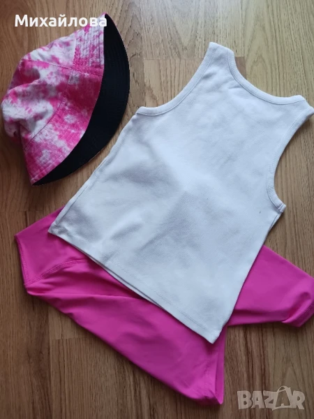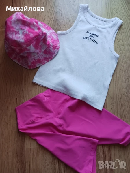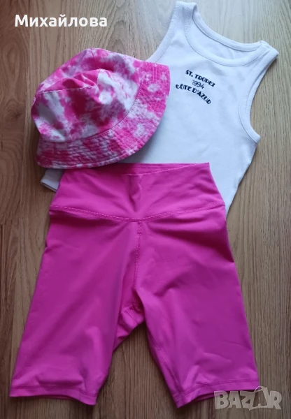 Сет от 3 части - къс клин, топ и шапка в цикламено и бяло. Приятна материя. Обличани са два пъти. Почти нови. Актуални цветове за лятото.
