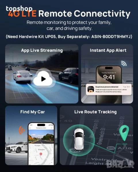 【4g дистанционно и 24/7 наблюдение на паркирането】останете свързани с колата си по всяко време и навсякъде чрез 4g LTE (необходимо е да закупите комплект кабели up05 отделно, asin: B0DDT9HMYJ). Предните и задните видеокамери осигуряват сигнали в реално време, използвайки AI алгоритми, за да игнорират фалшиви аларми (като например листа, метнати от вятъра). Използвайте приложението 70mai, за да локализирате колата си дистанционно и да гледате кадри на живо. Заснемането с ускорен кадър компресира 24 часа до 2 минути, спестявайки място за съхранение и не пропускайки критични събития.
