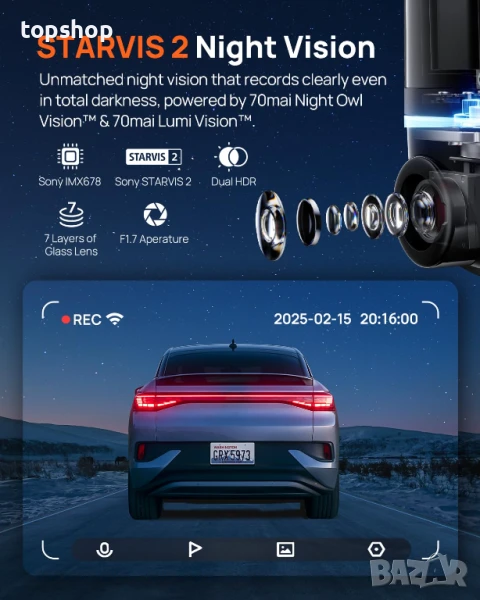 【Super STARVIS 2 Night Vision】Оборудвана със STARVIS 2, предната и задната част на видеорегистратора улавят с 88% повече светлина за по-ясни и по-детайлни кадри при условия на слаба светлина. В комбинация със 70mai Lumi Vision (при паркиране), видеорегистраторът за автомобили осигурява пълноцветен запис дори в почти пълен мрак. Night Owl Vision допълнително подобрява яснотата през нощта с балансирана експозиция, намален шум и подобрен контрол на отблясъците, гарантирайки, че регистрационните номера и пътните знаци в далечината са ясно записани.
