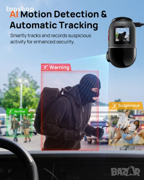 【AI Motion Detection 2.0 и аварийно заключване на видеото】 Въртящата се предна камера автоматично следва движещи се обекти, като гарантира, че никаква подозрителна активност няма да остане незабелязана. В случай на сблъсъци или внезапни сътресения, видеорегистраторът запазва 10-190 секунди преди и 20 секунди след събитието, като сигурно заключва клипса, за да запази важни доказателства.