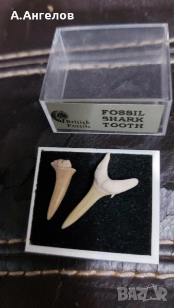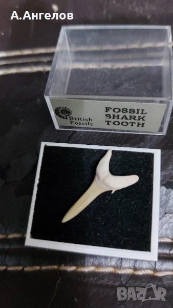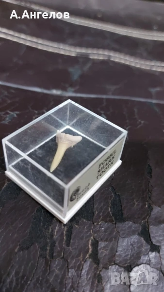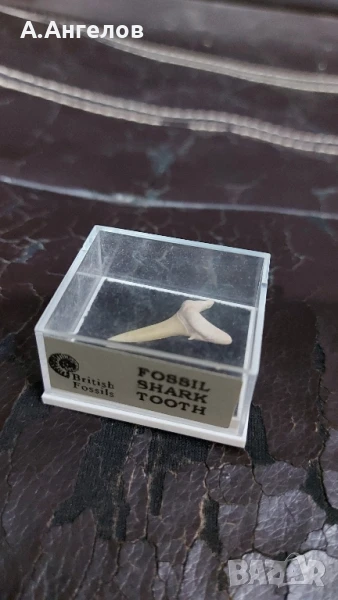 Зъб на праисторическа акула с допълнителни малки зъби. Живяла е преди около 65млн. години. Размери- 2,5см. Оригинална фирмена кутия. Размери на кутията- 4/3/2см.