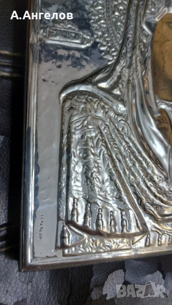 Винтидж икона , изработена от сребърно фолио. Наличие на знак Fi Ag 8g 336 Размери-18/15/1,5см.