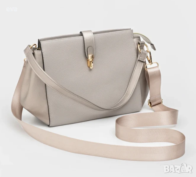 • Чанта Eden: Перлен металически бежов цвят. PU външна част, полиестерна подплата. Прибл. 24 см х 10 см х 21 см.