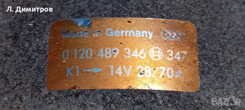 Оригинален алтернатор произведен от фирмата Бош - Германия, свален от лек автомобил Форд ескорт - бензин в работно състояние. Намотките на статора и на ротора са от медна тел, което е фактор за много дълга работна експлоатация и в бъдеще. Възможна е употреба му и за други модели леки автомобили. Изпращам на клиент срещу преведен на мое име и телефон депозит от 20 лв., до офисите на Еконт (срещу входа на Камъшит) или Спиди (бул. Македония № 2) в гр. Силистра, като този депозит ще бъде приспаднат от наложения платеж.