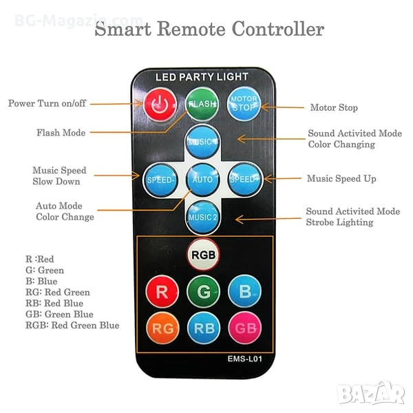 Диско лампата LED EMS-L01 е идеалният избор за всеки, който иска да създаде незабравима парти атмосфера. Тя предлага разнообразие от цветове и режими, лесно управление, удобно закрепване и универсално захранване. Поръчайте своята дLED диско лампа EMS-L01 още днес и превърнете всяко събитие в истински празник!