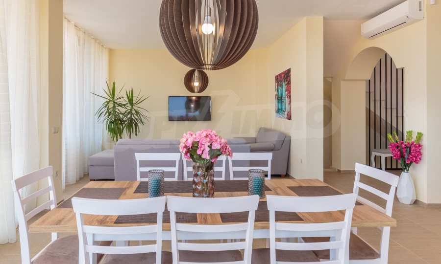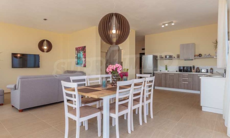 Напълно оборудвана кухня, маса за хранене за 10 души и кът с мека мебел;