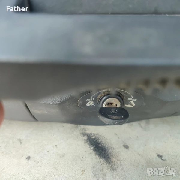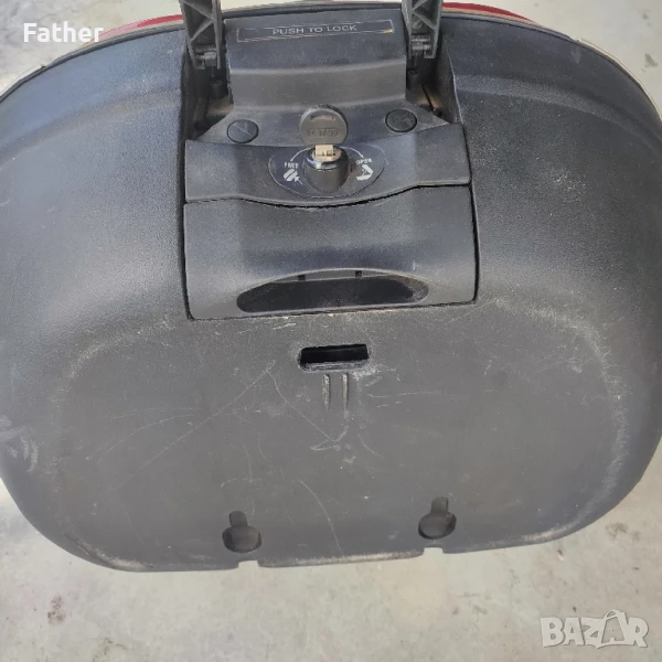 Куфара е здрав и в много добро състояние. литрите не мога да кажа колко са но е от големите. Събира две каски без проблем.