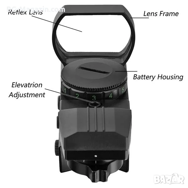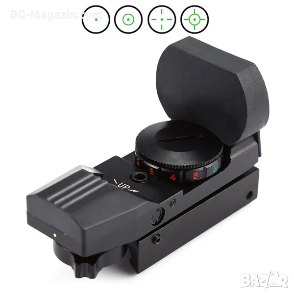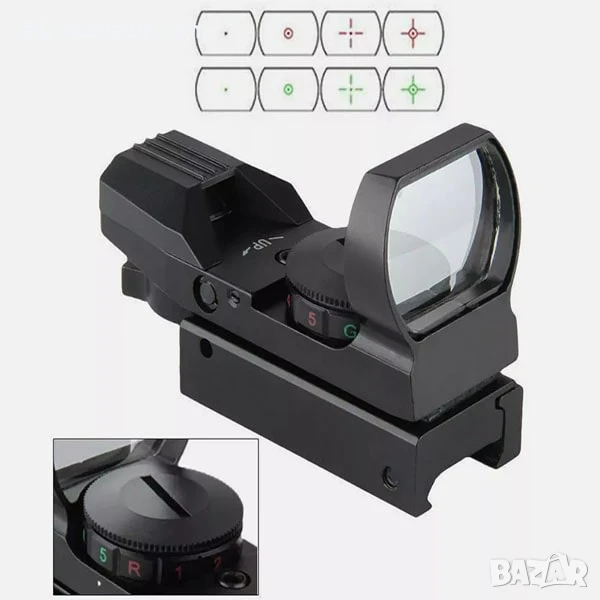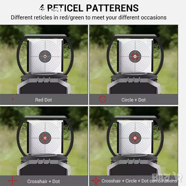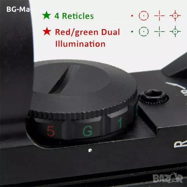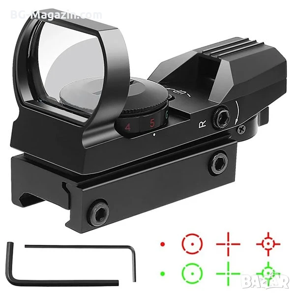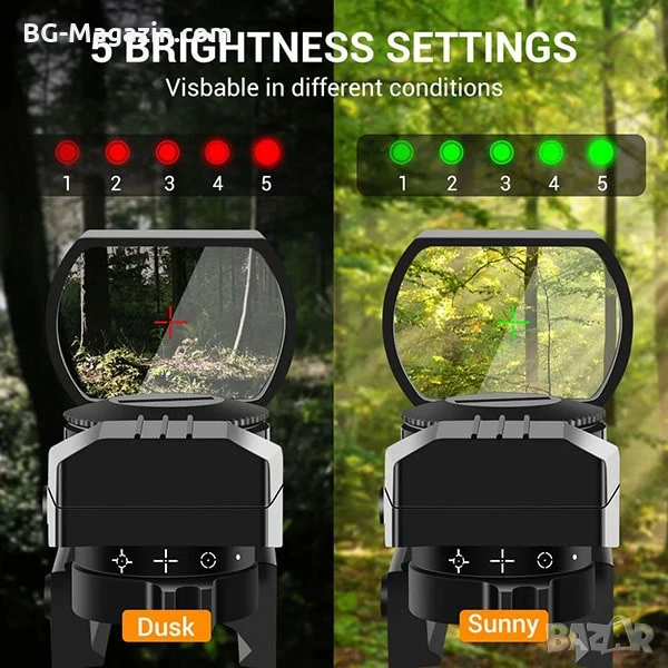 – Двуцветен мерник с регулируема яркост: Червеният и зеленият мерник с 4 различни вида и 5 нива на яркост ви позволяват да адаптирате прицела към различни условия на осветеност, осигурявайки оптимална видимост във всяка ситуация.