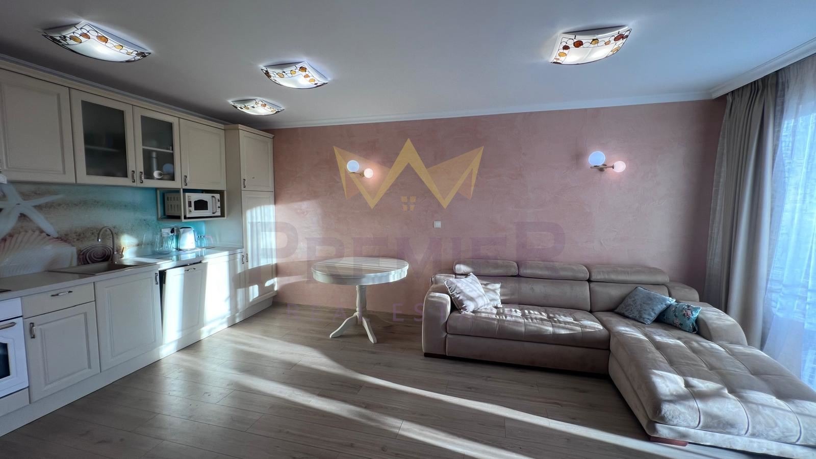 Разпределение: светла и просторна дневна с кухня и трапезария, две самостоятелни спални, две бани с тоалетни, голяма тераса с панорамен морски изглед