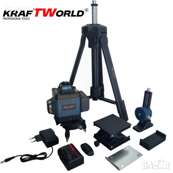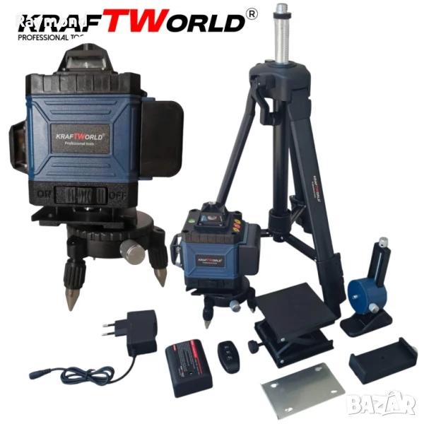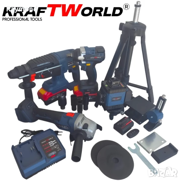 ✅ Гаранция: 36 месеца✅ 5в1 комплект – нивелир, ъглошлайф, гайковерт, винтоверт, перфоратор✅ 4 батерии 24V + 2 зарядни – продължителна работа без прекъсване✅ Пълен набор от приставки, вложки, стойки и куфар✅ Безчеткови машини с висока мощност и дълъг животМощност, прецизност и универсалност – всичко в един куфар.Представяме ти акумулаторния комплект 5в1 от KraftWorld, създаден за професионалисти, които търсят надеждност и мобилност. Този комплект комбинира 4 безчеткови машини с висока мощност и 4D лазерен нивелир със зелени линии и пълен набор от стойки, за да ти осигури пълен контрол във всяка ситуация – от груб монтаж и пробиване, до финален монтаж и нивелиране.Благодарение на включените батерии 24V и две отделни зарядни, ще работиш без прекъсване, без компромис в мощността и с пълна свобода на движение.Впечатляващото при този комплект не е само броят на включените инструменти, а функционалността и съвместимостта между тях – особено при гайковерта, който с помощта на бързозатягаща приставка тип патронник се трансформира в пълноценен винтоверт/бормашина. Това ти дава възможност да пробиваш, завиваш и развиваш – с една и съща машина, според задачата.🪚 Ъглошлайф KraftWorld 24VАкумулаторният ъглошлайф е създаден за бързи и прецизни рязания върху метал, камък и други материали. Безчетковият мотор осигурява по-дълъг живот и по-малко загряване при продължителна работа. Благодарение на двете включени дискови плочи Ø125 мм, можеш да започнеш работа веднага. Уредът е оборудван с плавен старт и защита от претоварване, а ергономичната дръжка осигурява удобство и контрол при рязане и шлайфане.🔩 Гайковерт KraftWorld + приставка винтовертТози мощен гайковерт е истински универсален инструмент с въртящ момент до 850 Nm – подходящ за автомобилни ремонти, строителни сглобки и монтаж на тежки елементи. Уникалното при него е специалната приставка с бързозатягащ патронник, която го превръща мигновено във винтоверт или бормашина – идеален за завиване на винтове и пробиване в дърво и метал. Това значително разширява възможностите му и го прави 2 инструмента в 1. В комплекта са включени и 3 ударни вложки – 18, 20 и 21 мм – за различни типове гайки и болтове.🛠 Перфоратор KraftWorld 24VУдарната бормашина тип перфоратор разполага със SDS-plus захват и силна ударна функция до 3J, което я прави ефективна при пробиване в бетон, тухла и твърди повърхности. Подходяща както за пробиване, така и за къртене при леки демонтажни дейности. Вграденото LED осветление осигурява видимост в тъмни работни зони, а ограничителят за дълбочина помага за максимална точност при монтаж.📏 Лазерен нивелир KraftWorld 4DЛазерният нивелир със зелен лъч прожектира 16 ясни и ярки линии в 4 равнини, гарантирайки максимална точност при нивелиране, монтаж и прецизно подравняване. Устройството е самонивелиращо се, с аларма при отклонение над 3°, и има режим за работа под наклон. Работи дълго време с 2 мощни батерии и може да бъде използван както върху пода, така и на височина, благодарение на 5 вида включени стойки, сред които телескопична тринога, повдигаща стойка, стойка за стена, магнитна основа и вакуумен държач. Незаменим инструмент при монтаж на конструкции, окачени тавани, плочки, мебели и други довършителни дейности.Съдържание на комплекта:🔩 Машини (всички безчеткови, 24V):Акумулаторен ъглошлайф2× режещи диска Ø125 mmАкум