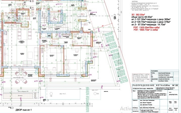 Ап.1 е с ЗП- 107,30 кв.м, на партерен етаж, с изложение югоизток с веранда и собствен двор от 369 кв.м.