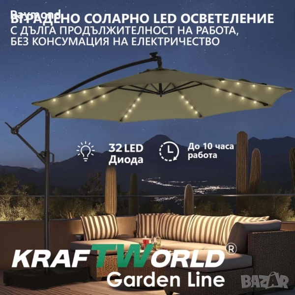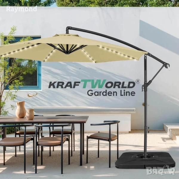 ✅ Луксозен висящ чадър 3×3 м с 32 LED светлини – модел Monaco✅ Плътен плат 220g/m² – UV и водоустойчив | Цвят: Бежов✅ Соларен панел с автономно осветление до 4 ч.✅ Здрава прахово боядисана конструкция с Ø50 мм основна тръба✅ Стилен дизайн от KraftWorld GardenLine – за градини, басейни и заведения☀️ Monaco от KraftWorld GardenLine – луксът под открито небе.Преоткрий лятото с премиум градинския чадър Monaco – висящ модел с изискан бежов цвят, създаден да осигури не просто сянка, а стилна атмосфера и комфорт през целия ден… и нощта. Част от селекцията KraftWorld GardenLine, този модел комбинира елегантен дизайн, висококачествени материали и практична функционалност за изключително изживяване на открито.🌙 32 LED светлини, деликатно вградени в спиците, се захранват от соларен панел, осигурявайки меко и романтично осветление вечер, без нужда от кабели или електричество. Перфектно решение за вечерни събирания, градински вечери или ресторанти с открити зони.🛡️ Платнището е изработено от плътен 220g/m² полиестер, устойчив на UV лъчи и влага, с гаранция за дълготрайност и наситен цвят. Висящата конструкция позволява свободно поставяне на мебели отдолу, без ограничения и без централна тръба, което осигурява максимален комфорт и пространство.⚙️ Характеристики на модела Monaco:📏 Размер: 3×3 м | Височина: 250 см🌈 Цвят: Бежов – неутрален, подходящ за всеки екстериор💡 LED светлини: 32 броя, със соларно захранване🔋 Соларен панел: 0.7W | Време за зареждане: 8 ч. | Време на работа: до 4 ч.☂️ Плат: Плътен полиестер 220g/m² – UV защита + водоустойчивост🏗️ Рамка: Прахово боядисана стомана | Ø50 мм основна тръба⚖️ Тегло: 16 кг📐 Основа: кръстата, 100х100 см🔄 Въртящ механизъм за прецизно регулиране на сянката🔧 Отваряне: с манивела – плавно и без усилие💬 Monaco е създаден за:Вили и частни градиниХотели и ресторантиТераси, басейни, открити зони с изискан стил✨ Независимо дали искаш да впечатлиш гостите си или просто да се насладиш на лично кътче под сянката, Monaco от KraftWorld GardenLine е изборът за онези, които не правят компромис с качеството и визията.📦 Поръчай сега и превърни двора или терасата си в стилен оазис на спокойствието и комфорта.