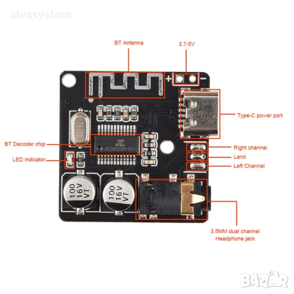 С тази платка всякакви обикновени тонколонки (с вграден усилвател) стават Bluetooth колонки, нужно е само захранване през USB-C. Могат да се свържат и директно слушалки към аудио изхода.