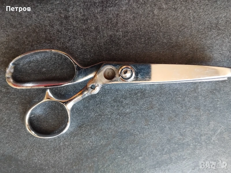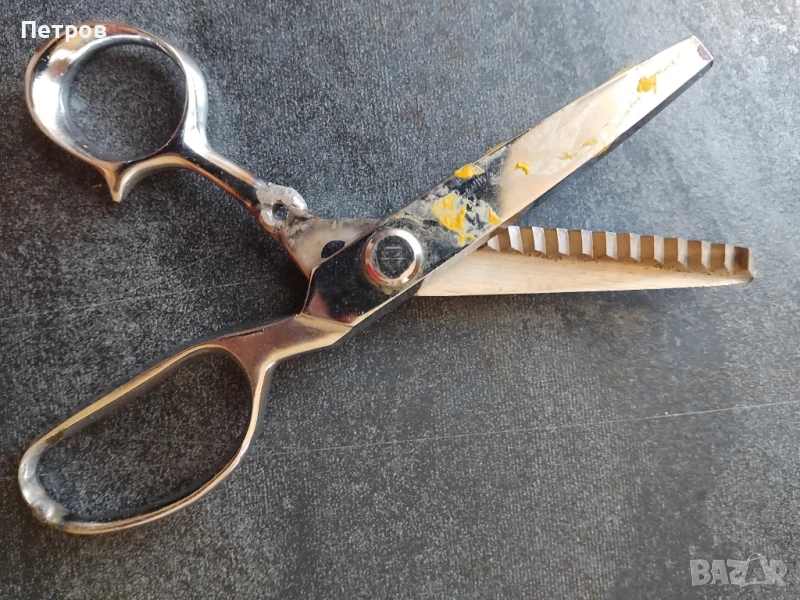 Ножица: декоративна „зиг‑заг” (или „крекинг”) ножица – най-често използвана за обработка на ръбове на плат, филц или хартия, при шиене и хартиени занаяти, за да не се протриват или да придадат декоративен ефект. Неръждаема, с пластмасови остатъци от предишна работа по дръжките и в лека корозия