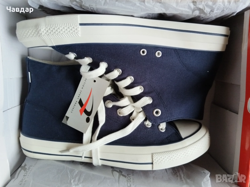 1. Кецове Action (високи). Цвят - тъмно-син, материал - текстил. Размер - 44, стелка - 29 см. Състояние - НОВИ с Етикет, в кутия. Цена - 15 евро (не подлежи на коментар).