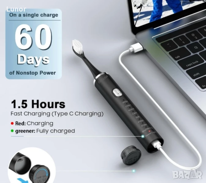 Интелигентна електрическа четка за зъби с 8 режима и мощен мотор (31 000 вибрации/мин). Вграден таймер спира на всеки 30 сек. за равномерно почистване. IPX7 водоустойчива, с 5 DuPont глави за нежно, но ефективно измиване. USB-C зареждане – 1.5 ч. зареждане = до 60 дни употреба. Подходяща за чувствителни зъби и избелване.
