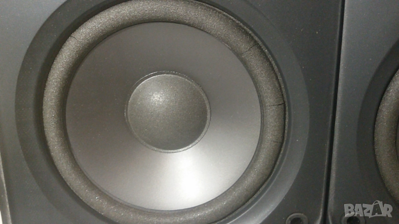 Махнах мрежичката (spreaker grille/cloth). Лесно се махат и слагат, не за залепени за дървото. На последните снимки се виждат говорителите на колонките. Гумичката/пяната/foam-ът (сивото) около големите говорители на двете колонки са с дефекти. На едната колонка има няколко радиални резки, а на другата има 2 по-големи дупчцици. Не знам колко би афектирало звука това и дали трябва да се сменят.