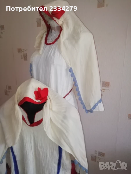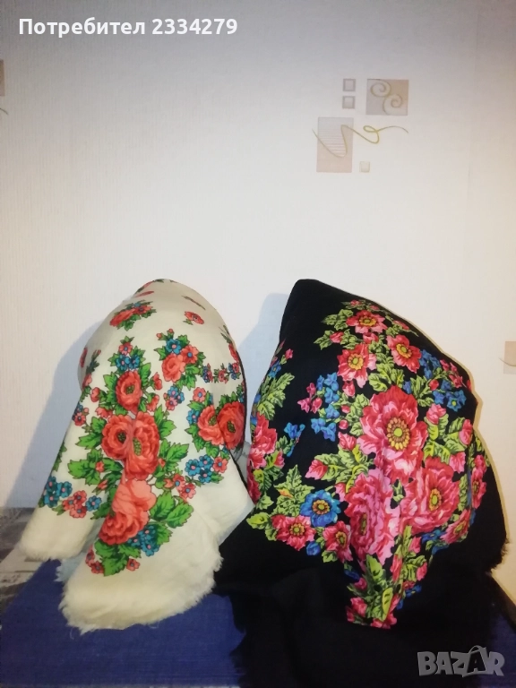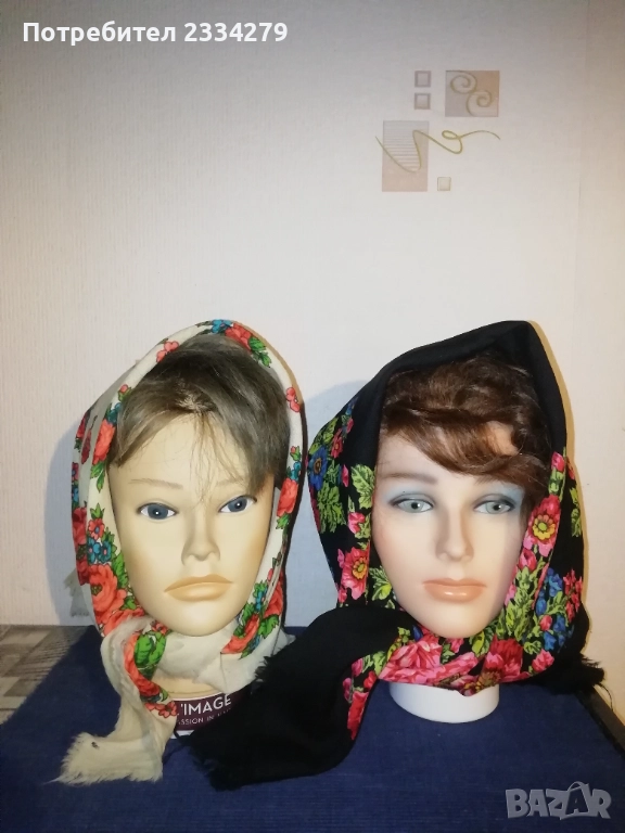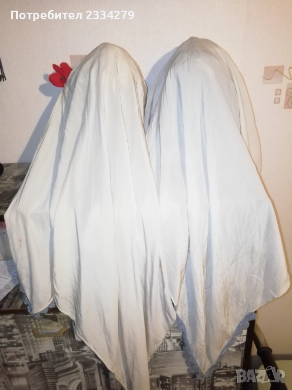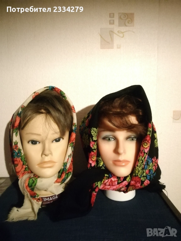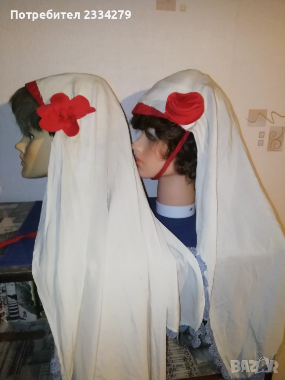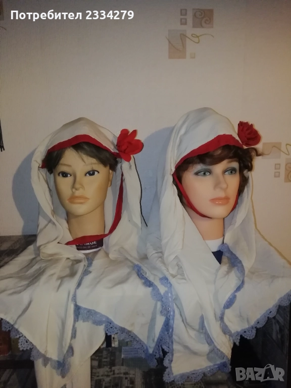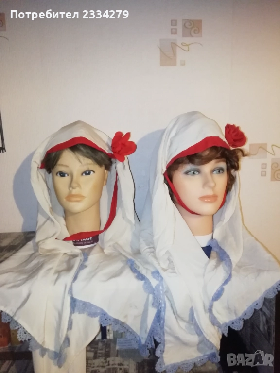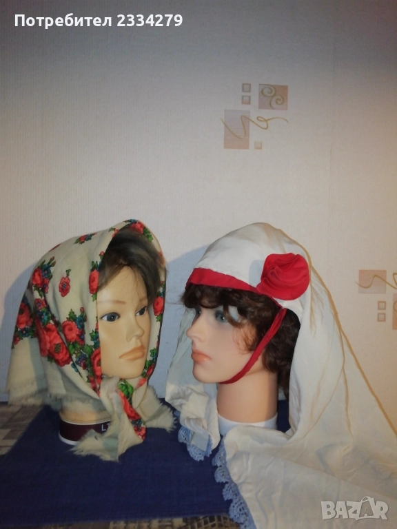 N:1 стари женски забрадки, отдолу със твърдо боне (нахлупва се), всичко е ръчна изработка, копринена кърпа, бродерия и декорация роза от плат и лента под брадата, цената за брой 20€.; N:2 женска фолклорна забрадка кърпа за глава, допълнение към народна-фолклорна носия., цена 9€. за брой.