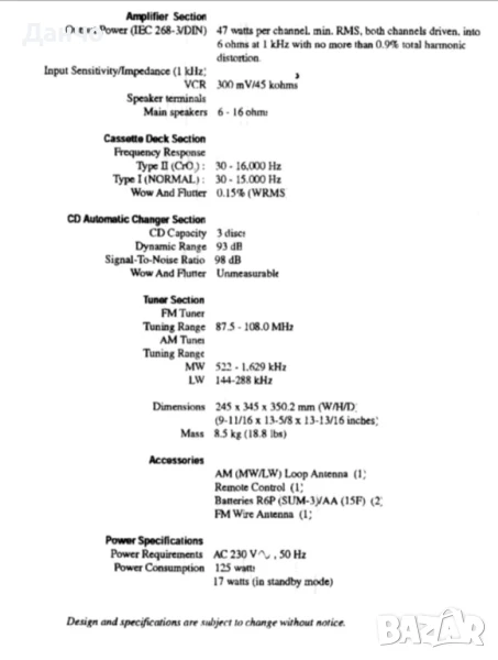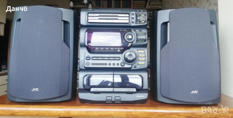 JVC от 6-та серия, върховия модел на марката за 98-99година. Преди месец на уредбата и е направена пълна профилактика. Направено и е пълно почистване и обезпрашаване. Сменени са ремъците и са обслужени механизмите и моторчетата на Дека и СД-то. Всичко по уредбата работи перфектно. И двете гнезда на дека са реверсивни и имат функции за намиране на следваща песен. СД-то чете всичко без проблем, както оригинални така и записвани дискове. Уредбата е от малкото които предлага два различни начина за стартиране на диска. Единият е от 1 песен, а другия е от песента на която сте го спрели последният път. Системата има еквалайзер с 6 предварително настроени позиции и опции за още 3 варианта по ваш избор (Общо 9). Също така има опция за двойно усилване на баса, възможност за автоматично изключване след края на касетата или диска или таймер за изключване след определено време. Сутрин може да ви събужда на радио, диск или касета с различни варианти на силата на звука. Системата има БАЛАНС и ДОЛБИ филтър, което също е голяма рядкост при този тип системи. Има си VCR (AUX) вход, което дава възможност за свързване към външен източник – телевизор, телефон, компютър и др. Уредбата има прекрасно звучене и хубав бас което е типично за марката. За тези които разбират повечко – уредбата не е със СТК, транзисторна е. По уредбата няма нищо счупено или съсипано, има дребни но несъществени следи от употреба във времето, все пак не е нова, но е добре пазена. Дистанционното си е оригиналното, няма прецакани бутони и работи идеално.