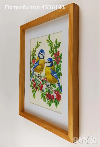Ръчно рисувана авторска акварелна картина, изобразяваща два синигера, кацнали на клон с червени шипки. Изпълнена с внимание към детайла и живи цветове, тази творба е вдъхновена от красотата на българската природа. Подходяща е както за подарък, така и за стилен акцент в интериора.