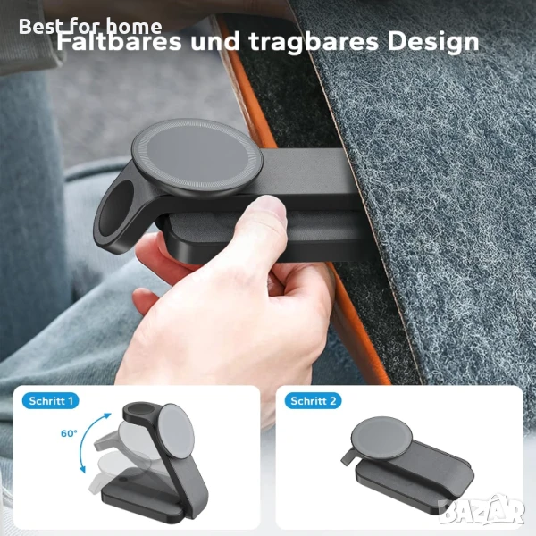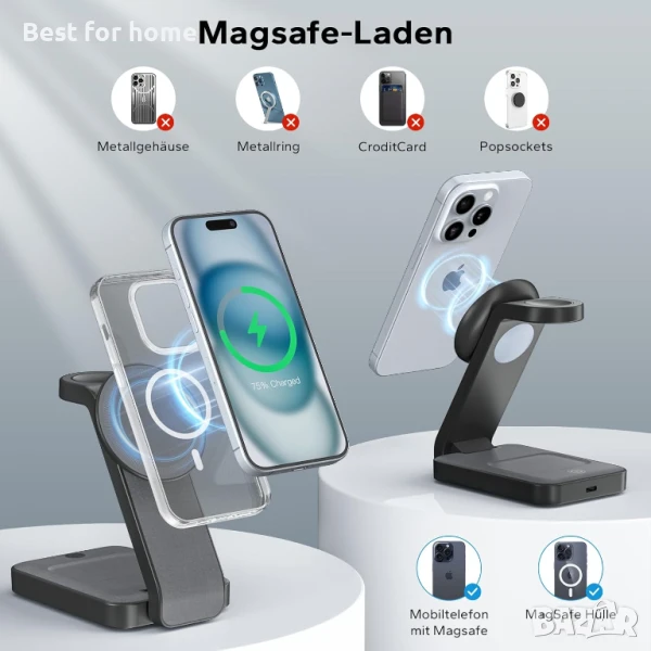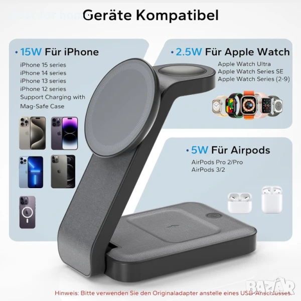 - Висока съвместимост - Тази зарядна станция Magsafe работи с iPhone серии 12-16, Apple Watch серии 2, 3, 4, 5, SE, 6, 7, 8, 9, Ultra (не работи с часовници Samsung), Airpods 3/2/pro (не работи с Airpods 1). Моля, използвайте с магнитен калъф или магнитен пръстен, когато използвате с iPhone 8 до iPhone 11 и други немагнитни, но QI устройства.