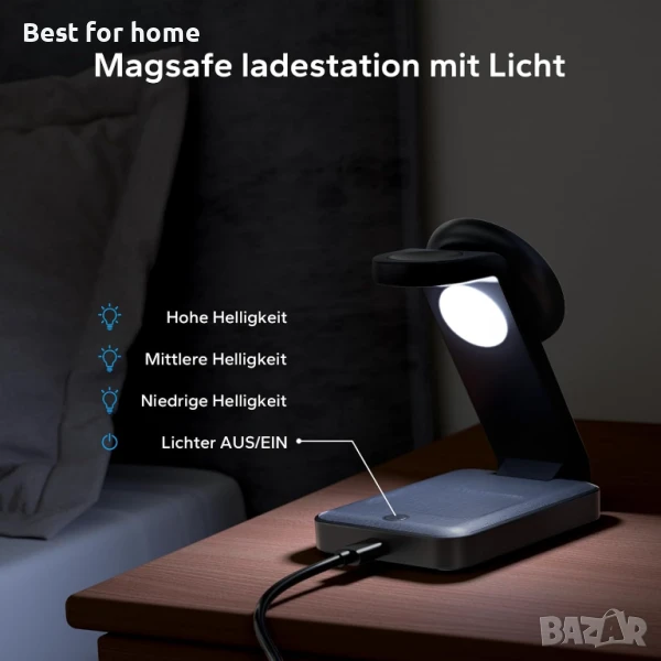 - Четири режима на околна светлина – зарядната станция Magsafe има четири режима на осветление: висока яркост, средна яркост, ниска яркост и изключено осветление, които могат лесно да се регулират с натискане на бутон. Можете да изключите индикаторната светлина, докато спите, за да не нарушавате нощния си сън.