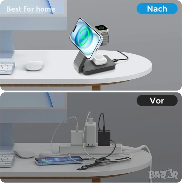 Зарядна станция Magsafe 3 в 1 - Нашата индуктивна зарядна станция може да зарежда iPhone, Apple Watch и Airpods едновременно и да поддържа бюрото ви подредено. Това зарядно устройство Magsafe е съвместимо и с други смартфони с Qi стандарт. Включеният QC3.0 адаптер е необходим за активиране на режим на бързо зареждане.