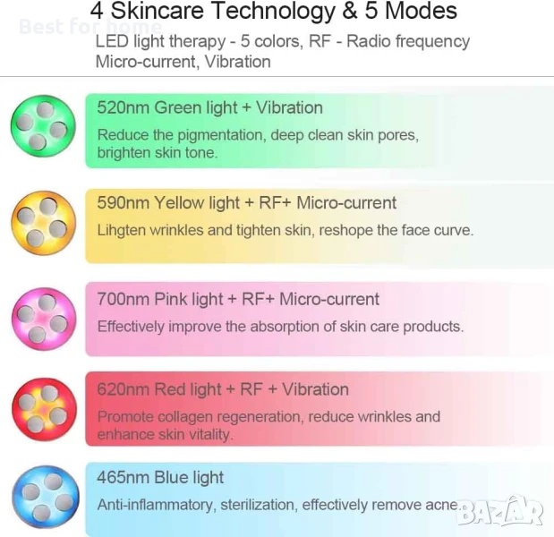 - LED светлинна терапия: Определени дължини на вълните на LED светлината стимулират клетъчния метаболизъм и подобряват кожата на лицето. Вибрационният масаж на кожата и мускулите на лицето ускорява метаболизма и прави кожата по-плътна. Комбинацията от тези 2 технологии ще подобри фините линии и бръчки, ще подобри линиите на челото и отпускането на кожата.