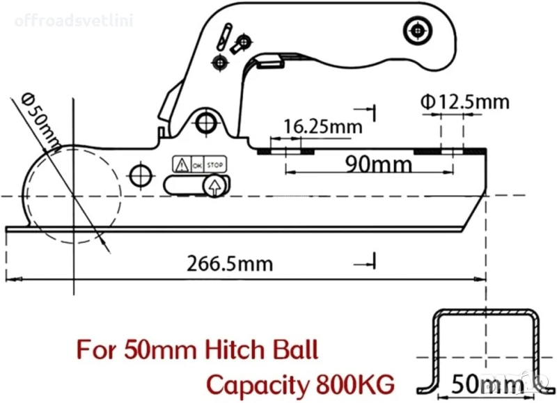 Заключваща лапа тип квадрат за теглич 50мм за ремарке до 800 кг
