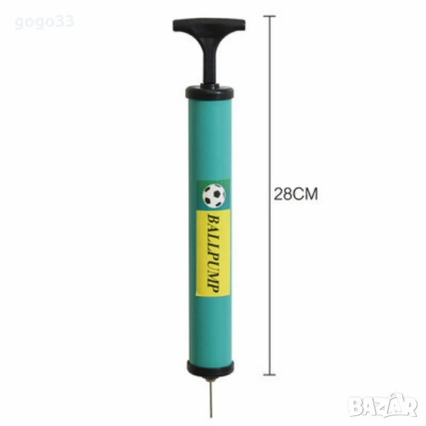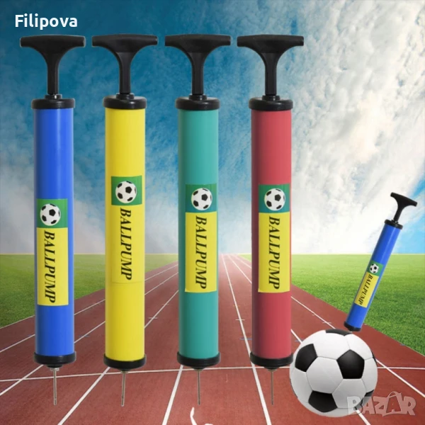 Преносима ръчна помпа за топки в различни цветовеЦена: 10лв.Дължина: 28 см;Материал: Здрава пластмаса (PP), устойчива на външни условия;Аксесоар: Метална игла за спортни топки;Употреба: Подходяща за футбол, баскетбол, волейбол, плажни артикули, плувни пръстени и други;Компактност: Лек и удобен дизайн за лесно пренасяне;Цветове: Червен, син, зелен, жълт.