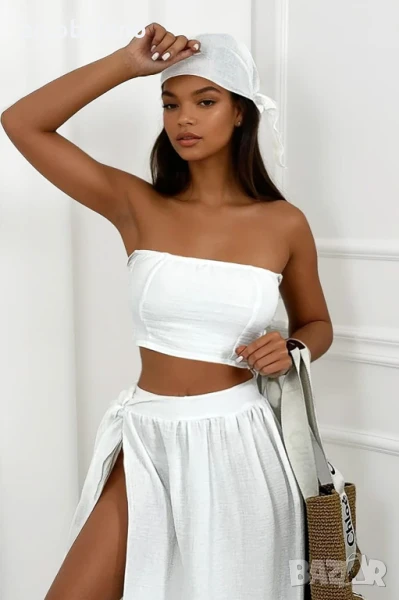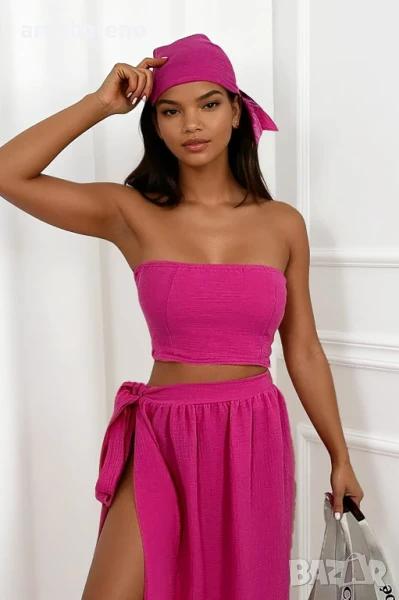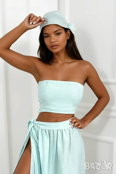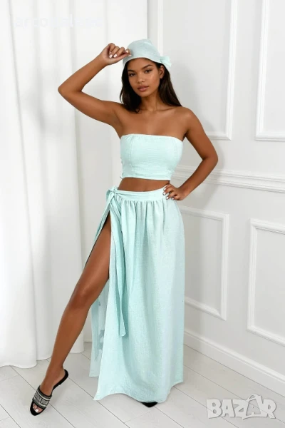Лек, ефирен комплект от муселин - идеален за лятото! Състои се от прилепнал топ, пола с връзки и стилен шал. Ефирен, женствен и изключително удобен. Изберете стил и комфорт в горещите дни!