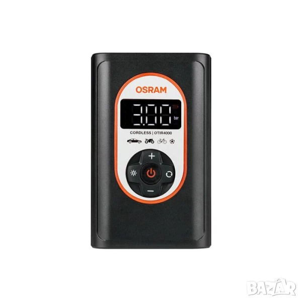 Компресор Osram модел 4000 с вградена батерия и удобен и голям бутон за стартиране.