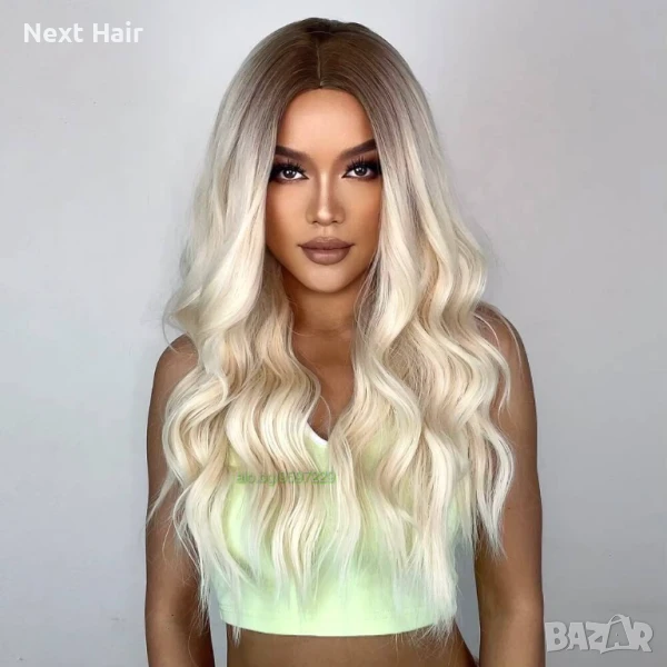 Висококачествена светло руса чуплива перука с тъмни корени на път → Обява 51058457
