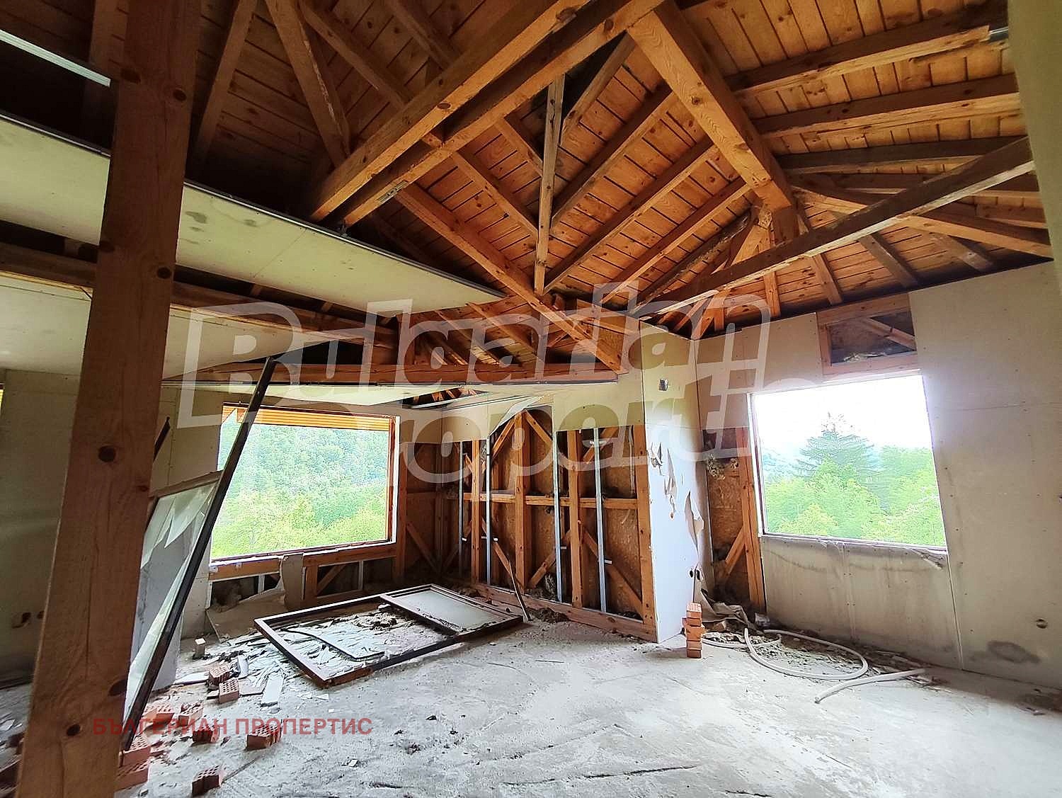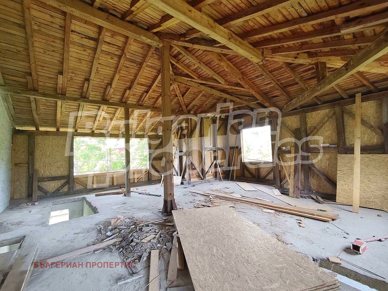 Висок тавански етаж с възможност за оформяне на още един пълен етаж с отворен план.