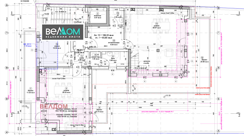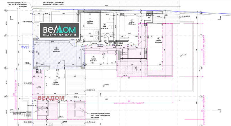 Агенция ВЕЛДОМ продава ТРИСТАЕН МЕЗОНЕТ ново строителство в района на Окръжна Болница Варна ( широк център ). Обща площ 217,71 м2, чиста застроена площ 186,33 м2. Проектът се реализира от доказъл се във времето инвеститор/строител, който няма недовършени или непродадени имоти. В момента въпросният обект е пред Акт 15. Изпълнява се стриктно по най-съвременни технологии с висококачествени материали. Състои се от: шести етаж- широка и светла дневна с кухненска ниша 38,67 м2, вх.антре 8,29 м2, санитарен възел, балкон 25,95 м2; седми етаж- 2 спални 14,51 м2 и 13,63 м2, баня/тоалетна, килер/дрешник-5,88 м2 , 4 тераси 8,17 м2, 16,48 м2, 6,09 м2 и 8,09 м2. За подробности вижте приложеното разпределение.