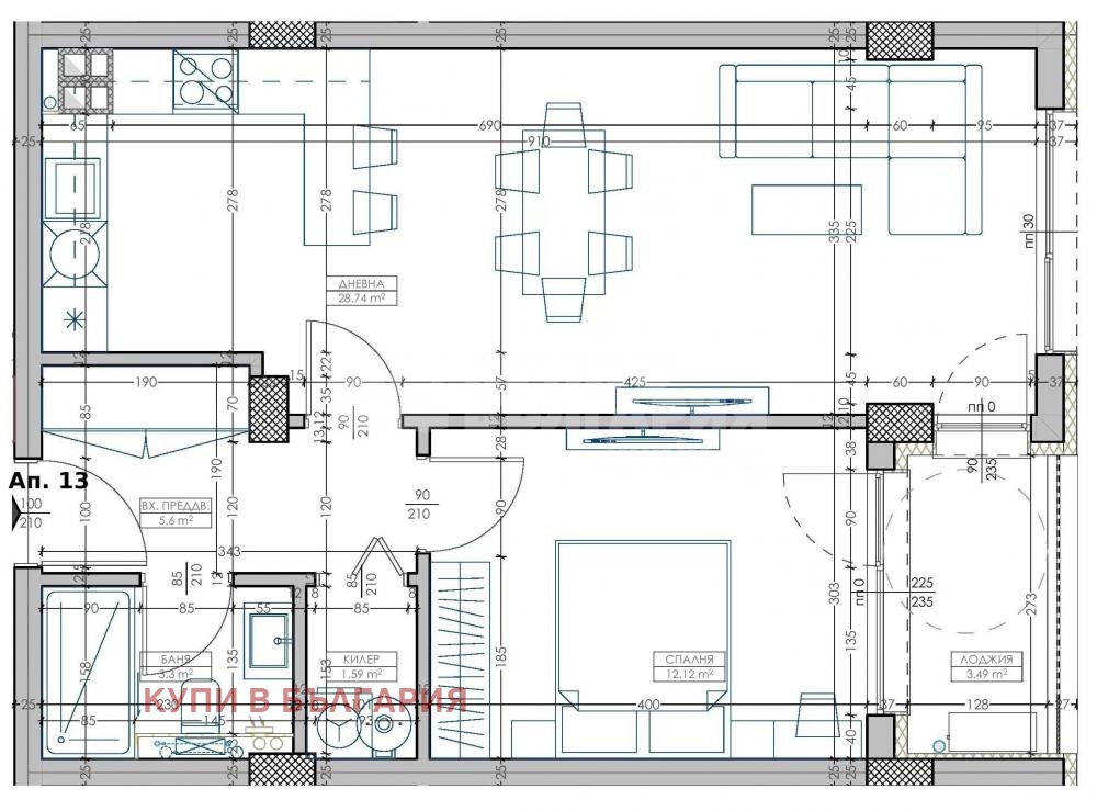 Купи в България Ви предлага за продажба двустаен апартамент в сграда ново строителство. Степен на завършеност - кота Първи етаж. Жилището има следното разпределение. Голяма дневна около 30 кв.м, спалня, баня с тоалетна, килер и тераса ID 30950