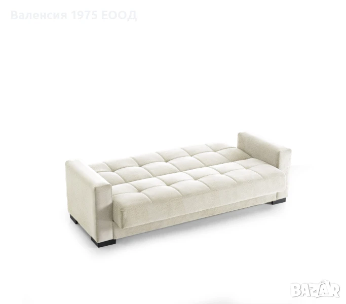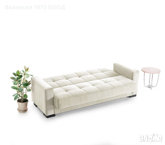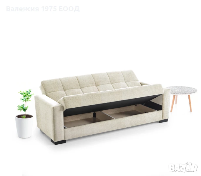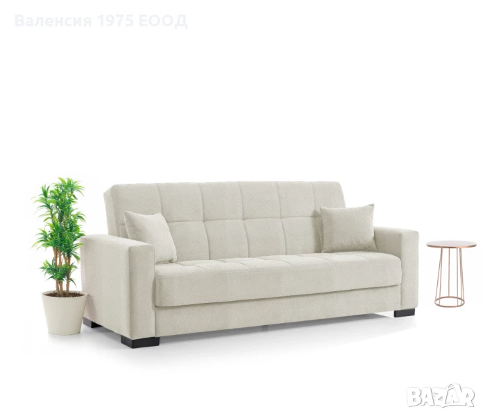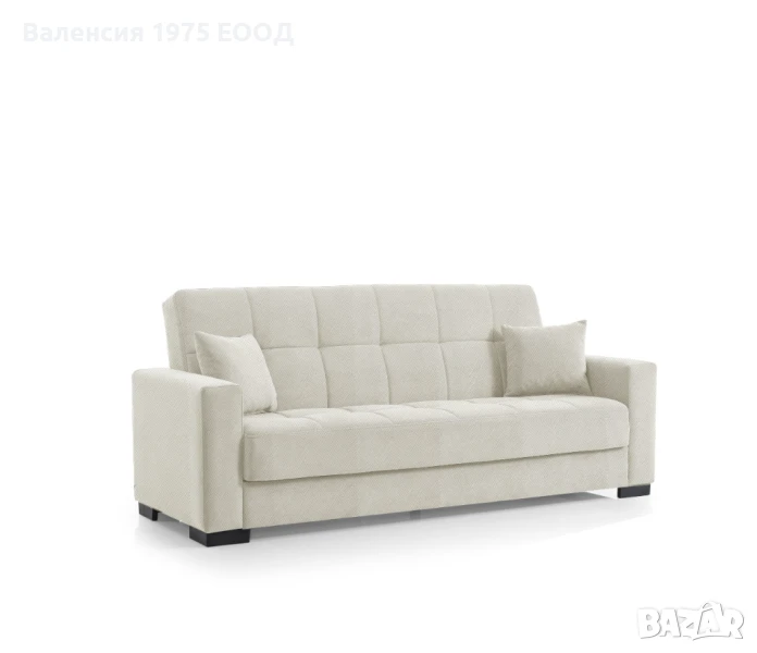 Диванът е с механизъм клик- клак и ракла. С две декоративни възглавници.