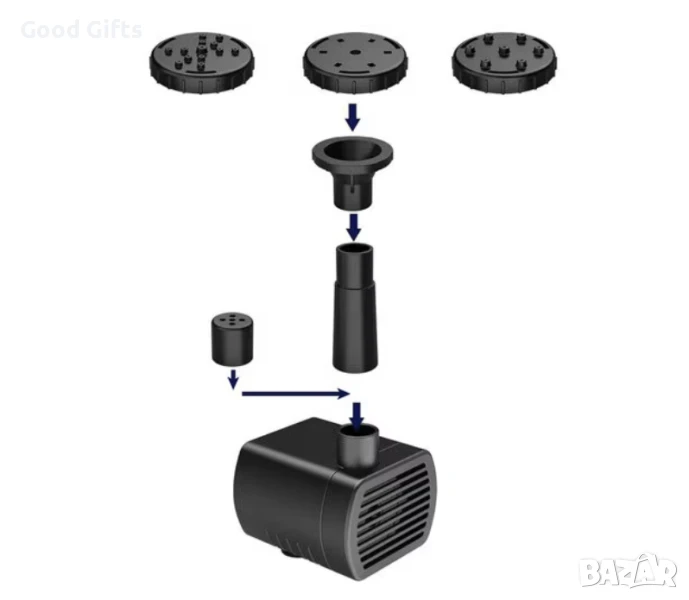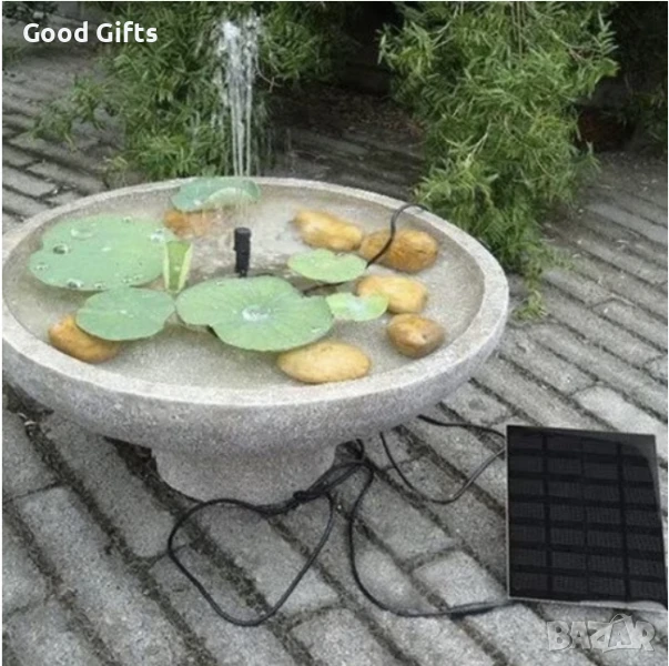 Градински соларен фонтан с филтър помпа, подходящ за езерце, корито или друг съд с вода.