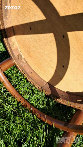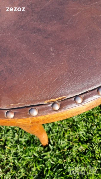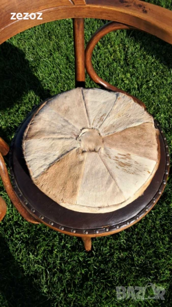 ратанова седалка,но през годините е подмена с кожена,която има забележка.Леко пукване на дървото на единия подлакътник-снимано.Продава се с възглавничката,която е от естествена кожа.