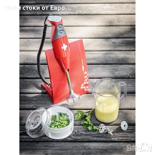 ЗА ЕКСПЕРТИТЕ - УНИВЕРСАЛНО УСТРОЙСТВО Bamix Swissline - мощна помощ за всички ваши кухненски потреби. Съдържа: 3 специални ножчета за многофункционално надробяване, разбиване, смесване / хомогенизиране, червена светлина SwissLine, бутилка 1000ml, задействащ аксесоар.