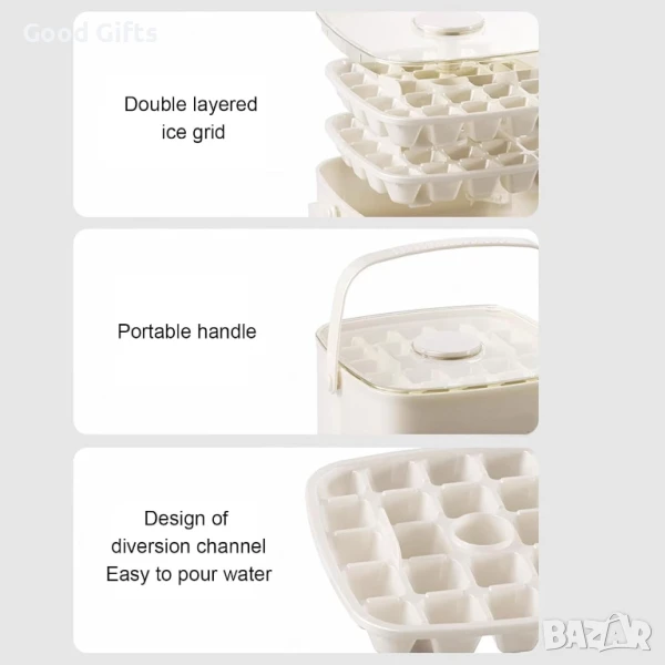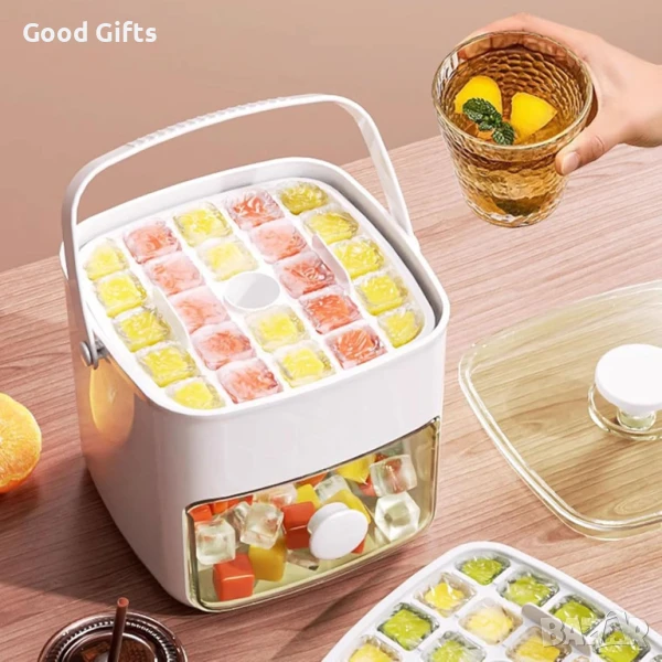 Забрави за разливането и трудното вадене на лед! Представяме ти интелигентен контейнер за лед с 3 форми, вградено чекмедже за съхранение и лесен натискащ механизъм. Просто напълни формичките, замрази, натисни с капака – и кубчетата падат направо в долното отделение, готови за употреба!
